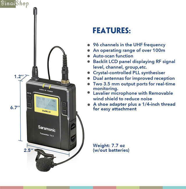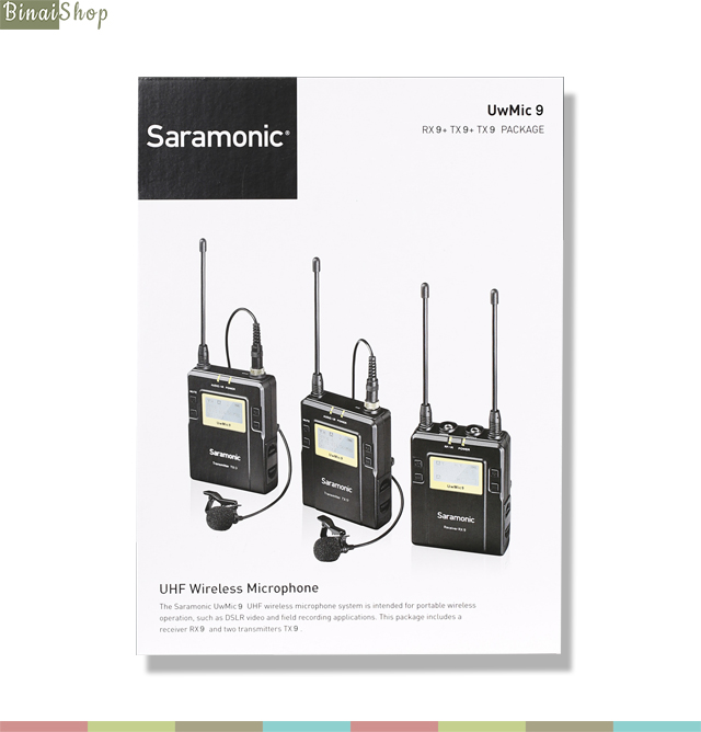 - 01 Bộ thu sóng Receiver Saramonic RX9 UHF.- 02 Bộ phát Transmitter TX9 UHF.